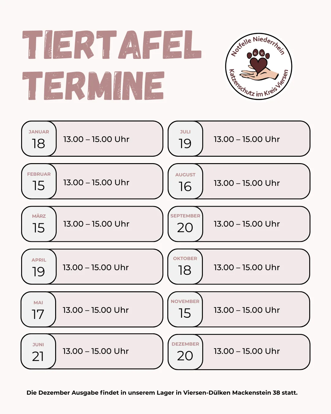 Futterspenden können im Rahmen der Tiertafel jeden dritten Samstag im Monat zwischen 12:00 und 15:00 Uhr abgegeben werden. Darüber hinaus nehmen wir Futterspenden bei uns in Dülken, in Schwalmtal und in Viersen-Süchteln an. Die Kontaktdaten hierfür lauten: