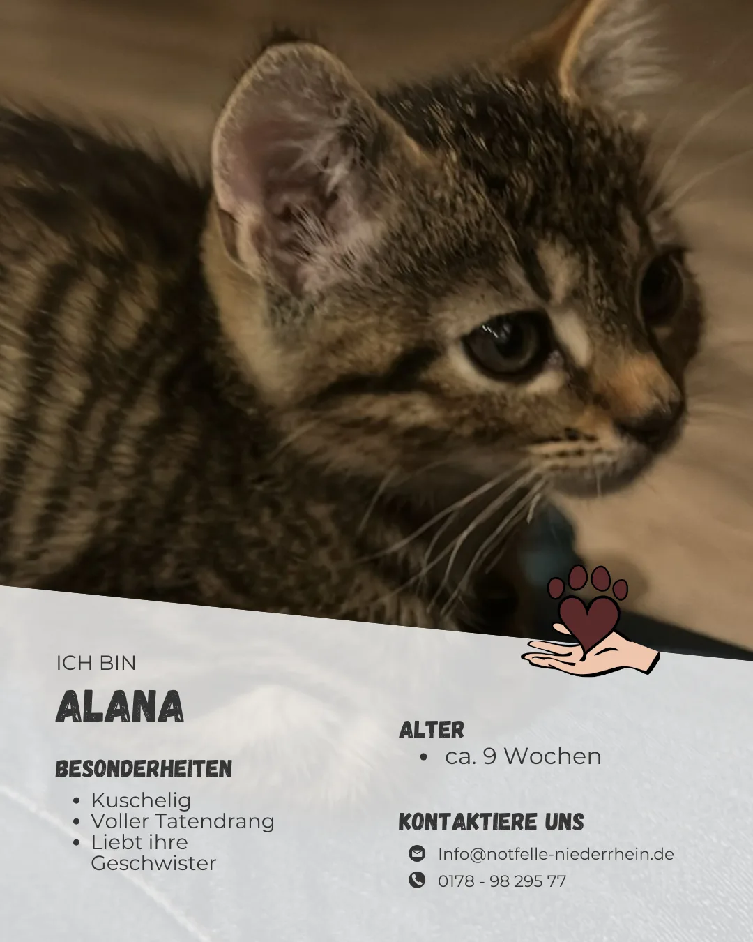⚠️ Alle unsere Tiere sind entweder bereits kastriert oder werden mit Kastrationsgutschein vermittelt. Sie sind mindestens einmal geimpft, vollständig geimpft oder erhalten einen Gutschein für die Zweitimpfung. Die Abgabe erfolgt stets mit Schutzvertrag.