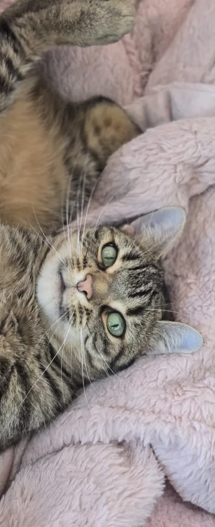 Aktuell sucht sie ein neues Zuhause, da es im bisherigen Umfeld zu Stress kam (insbesondere mit einem männlichen Mitbewohner und einer weiteren Katze). Dort hat sie angefangen immer wieder an verschiedene Stellen zu urinieren. In einem ruhigeren Rahmen ohne Druck und Konkurrenz zeigt sie sich deutlich entspannter. Ein zwischenzeitlicher Platz bei einem Bekannten ist leider aufgrund einer Allergie keine Dauerlösung.